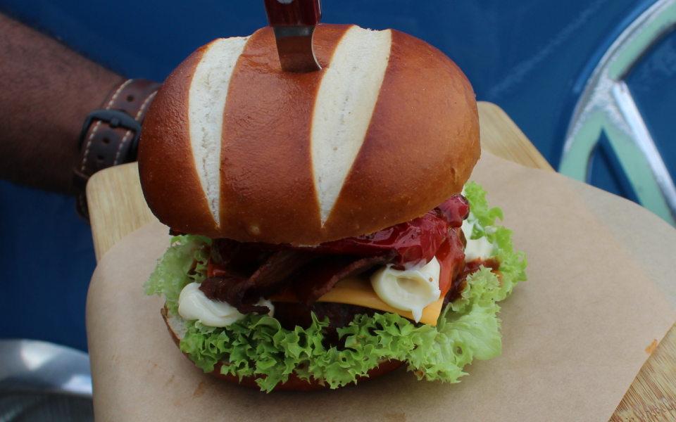 Wie lust er nou geen burger! Vanuit onze vintage T1 pick up of Oklahoma Smoker bakt onze braaimeester 100% Angus beefburgers. Hamburgers zijn een ode aan een perfect feest of evenement. Onze burgers hebben smaak en zijn zo goed als perfect met uien, huisgemaakte BBQ saus en veel meer opties. De burgers kunnen zelf door uw gasten worden aangekleed met verschillende topping of wij serveren ze 'pre-build' belegd met Lollo Rosso sla, pittige cheddar, met tijm en knoflook geroosterde uienringen, homemade BBQ saus en Hellmann’s mayonaise.