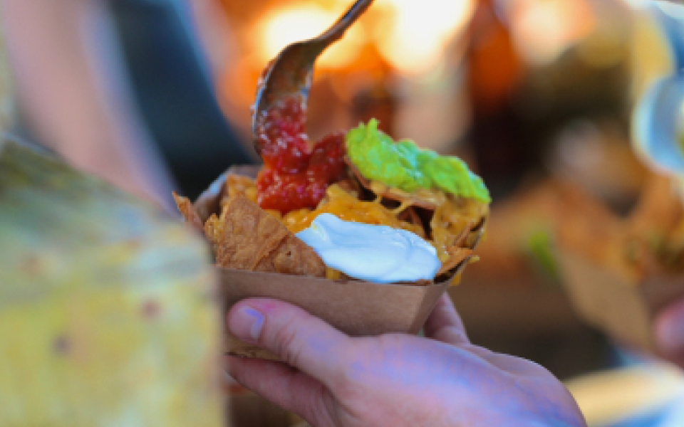 De favoriete snack uit Mexico. Nacho's zijn een graag geziene snack om menig foodfestival. Makkelijk te eten en zoveel smaaksensaties tegelijk. Het leuke van nancho's is dat je het aankleden zoals je wil. Van heel simpel tot extravagant, daarom één van onze favoriete snacks. huisgemaakte tortillachips gebakken in zonnebloemolie en gekruid met een eigen specerijenmix. Wij serveren deze favoriet met tomatensalsa, guacamole, sour cream en gesmolten cheddar.
